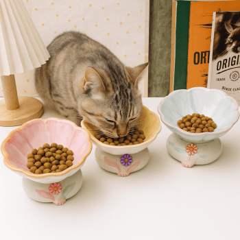 Elevated Ceramic Cat Bowl with Flower Design – Anti-Tip & Neck Protection
