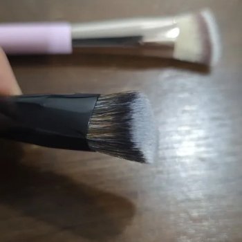I've been using this triangle brush for a while now and it's nothing short of amazing. The dense synthetic bristles blend my makeup flawlessly, without leaving any streaks or harsh lines. What I love the most is that it doesn't absorb my liquid and cream formulas so I can maximize their use. Plus, the comfortable grip gives me precise control over application which is particularly useful when working on detailed areas like under eyes or around the nose. Cleaning this tool is also effortless - an important factor considering daily usage! Its long-lasting, high-quality wooden handle adds to its overall appeal.